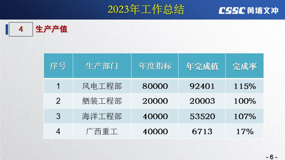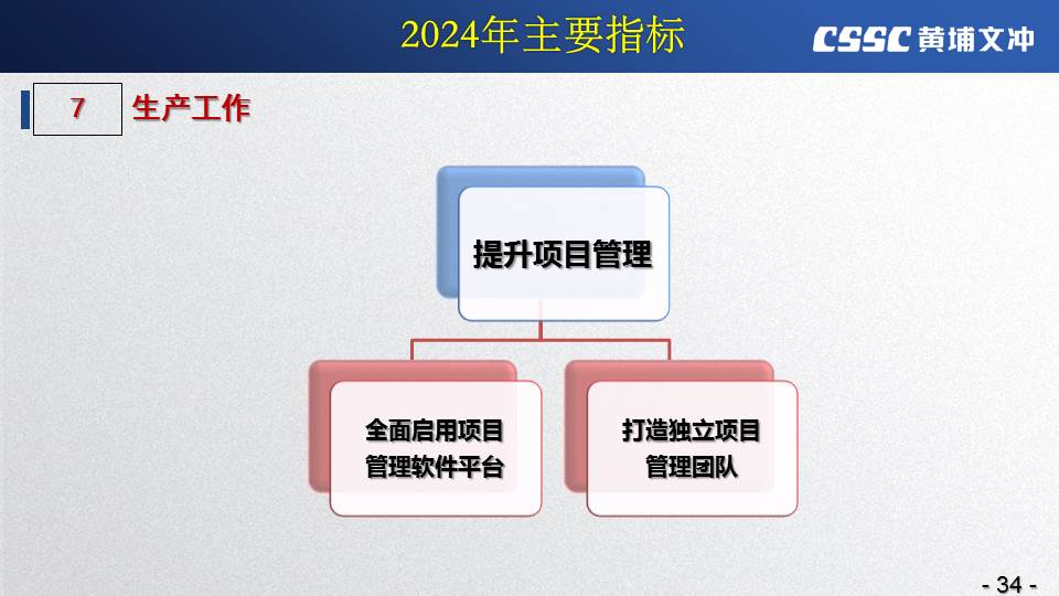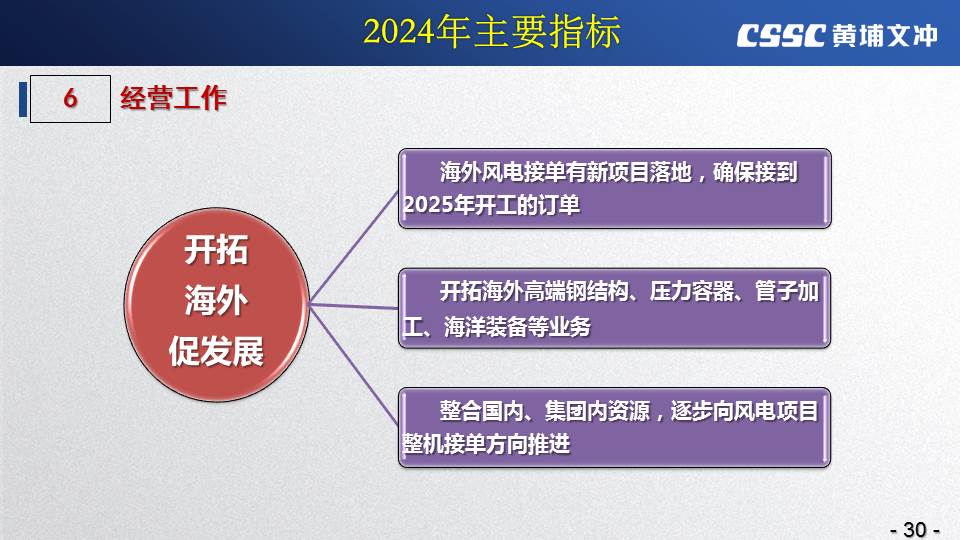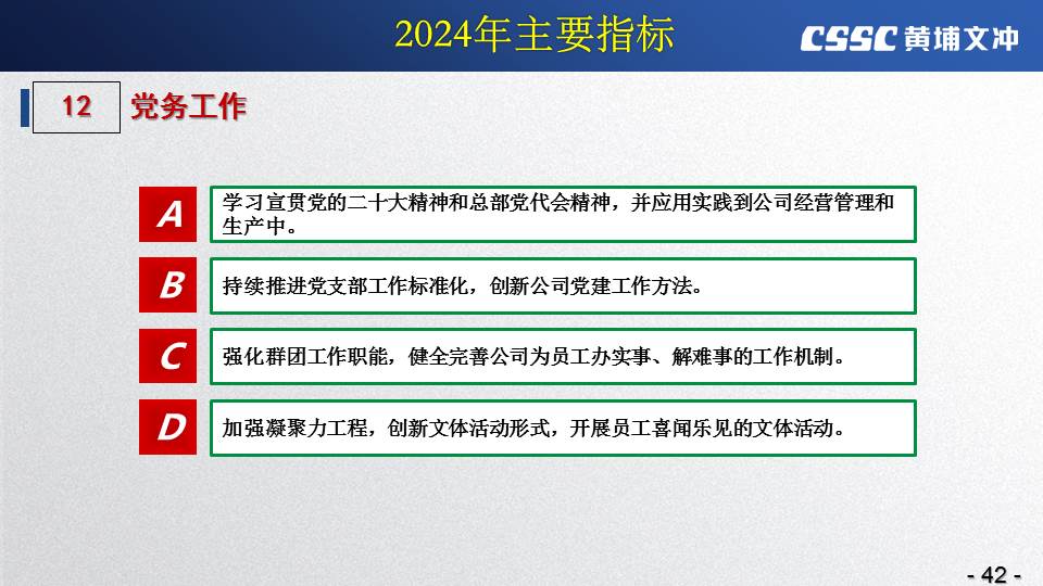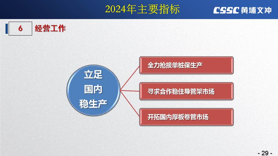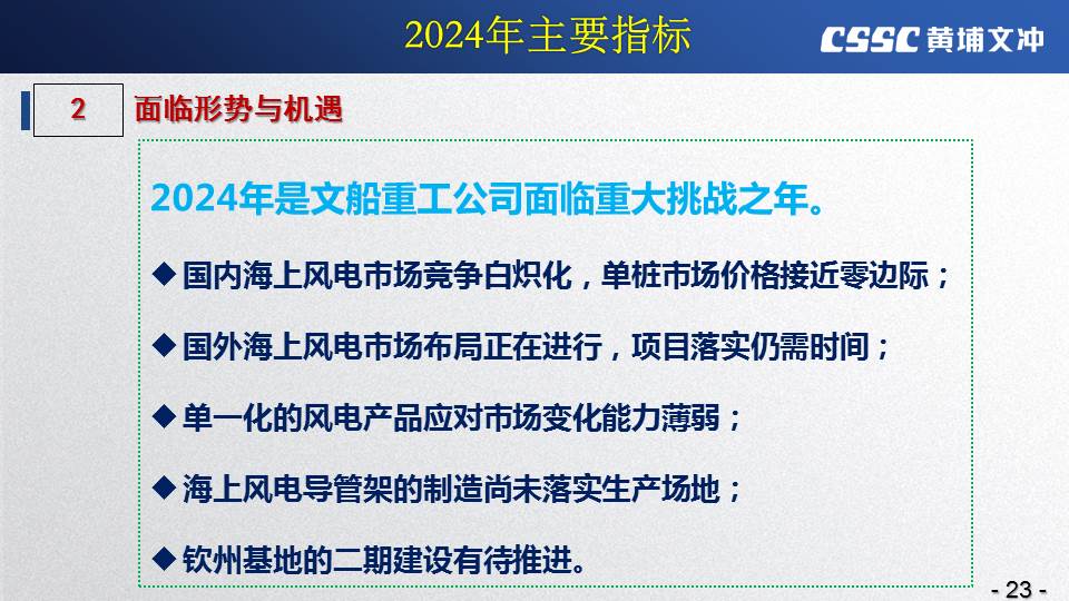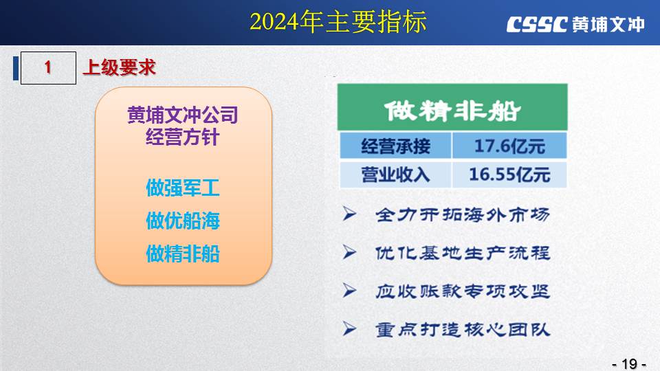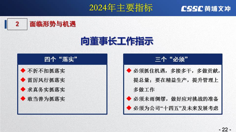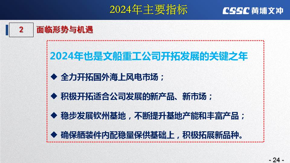黃埔文沖公司羅兵總經理指出,公司在過去的一年所取得的成績不容易,指標基本完成,海外訂單有實質性突破,國內訂單承接情況不錯,管理團隊精氣神不錯。面對當前的形勢機遇,羅總指出公司的未來發展大有希望!羅總要求全體干部員工要繼續保持高昂的斗志和滿滿的信心,繼續奮斗,并就公司2024年工作作了以下重要指示: